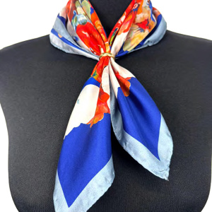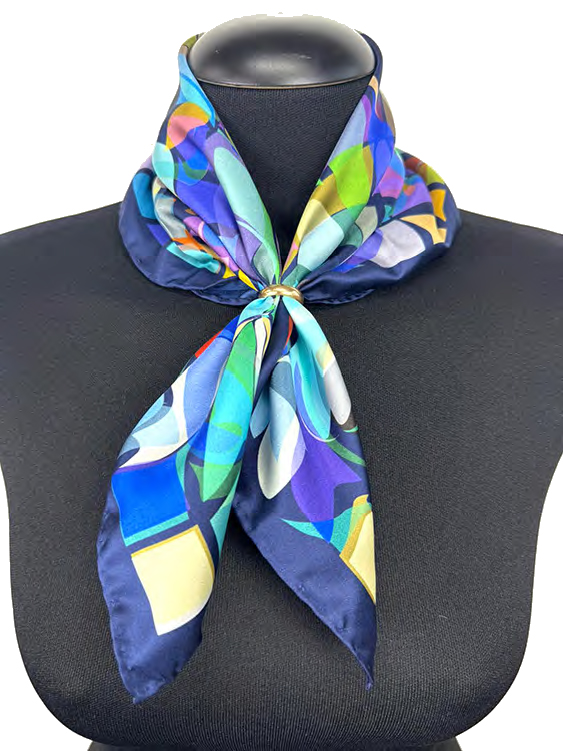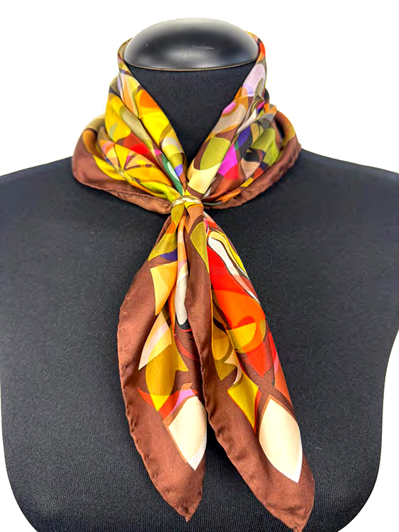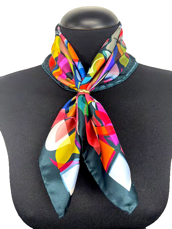 Foulard in seta 50×50 cm con tre miscele di colori, caratterizzata da elementi geometrici dai toni vivaci, incorniciati da un bordo coordinato che valorizza la composizione. La finitura con orlo arrotolato dona raffinatezza e leggerezza, rendendolo un accessorio femminile e versatile, ideale da indossare al collo, tra i capelli o come dettaglio su borse e outfit.